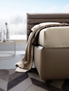 L’essenziale geometria delle linee di Phil, connaturata al riservato piglio dello stile nordico, si fa metafora di una segreta ricerca di stasi che arresti la frenetica corsa del quotidiano, laddove la vivace imbottitura della testiera confluisce in ordinati e paralleli moduli orizzontali, a limite e confine di una base dalle solide e regolari proporzioni che incorpora con silenziosa tenacia una preziosa e pratica area salvaspazio.